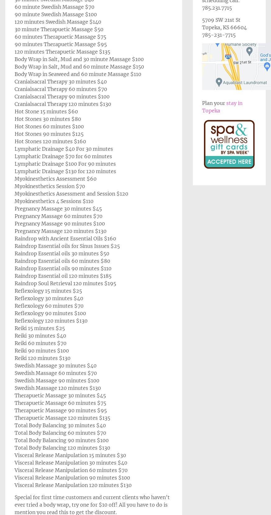Wrap and massage here I come :)))) I just scheduled my appointment after contacting multiple companies listed here. Tammie is very prompt, friendly, and professional. She responded within minutes of me leaving a vm. Sadly Topeka businesses lack customer service, follow up, or communication. I am looking forward to a well deserved pampering session!