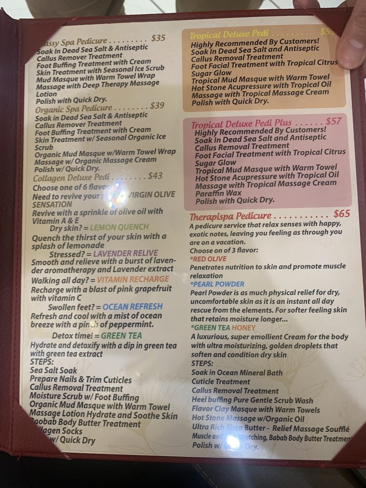 I was visiting from out of town and came in for a pedicure that was long overdue. The salon was busy but the manager made time to escort me to a chair and got me settled in while I waited for my nail tech to finish up on her current customer. Once she was done her attention was completely focused on me and she listened to my specific requests. Through out the entire pedicure she made sure that I was happy with her progress. I left very happy and satisfied and would highly recommend! ~JustaGeorgiaPeach