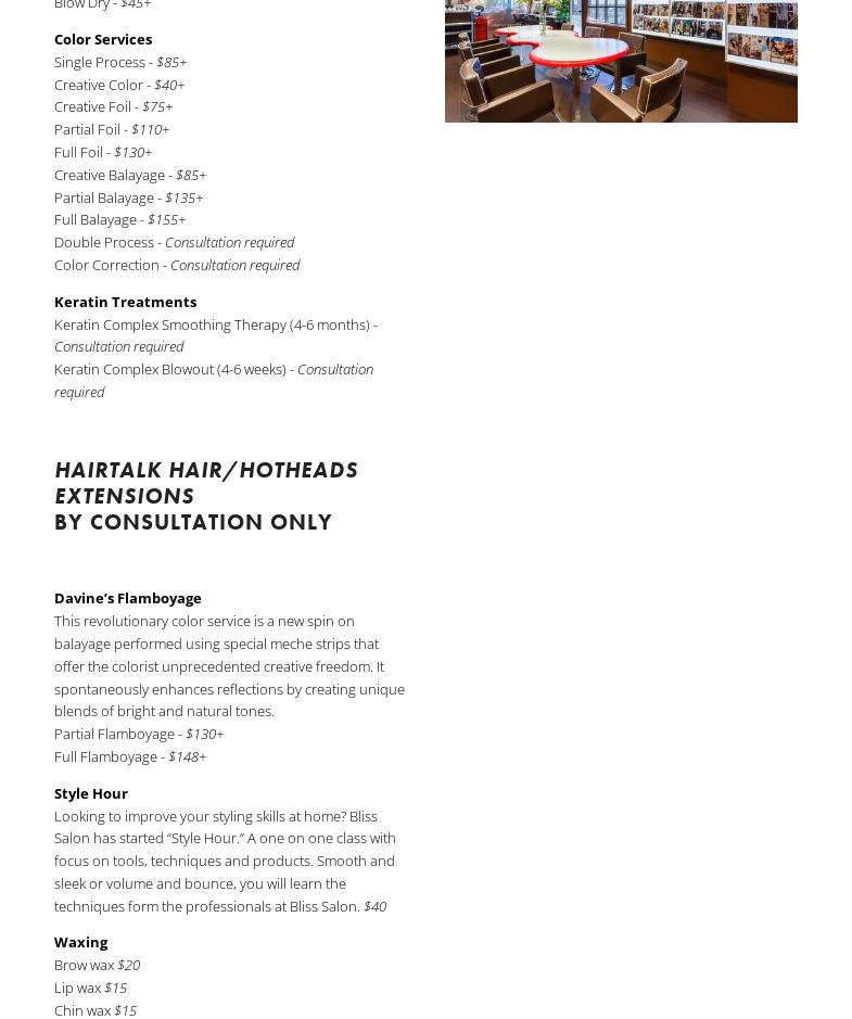 I have been going to Bliss for almost two years. I could never let anybody else touch my hair again! I have tried so many salons and my hair cut and foils were no where near the quality of Bliss. Lexi does my hair! The foils are always right to the root. The color is amazing and perfectly blended. The cut is always completely even, and always looks good, no matter how I wear my hair. Everybody compliments the color and cut, even months later it still looks good! Sometimes I wait a little too long. Lexi never makes me feel bad and always gets it looking great again! She also takes a lot of time to make sure everything is perfect. She does a very professional job. The salon... read full review