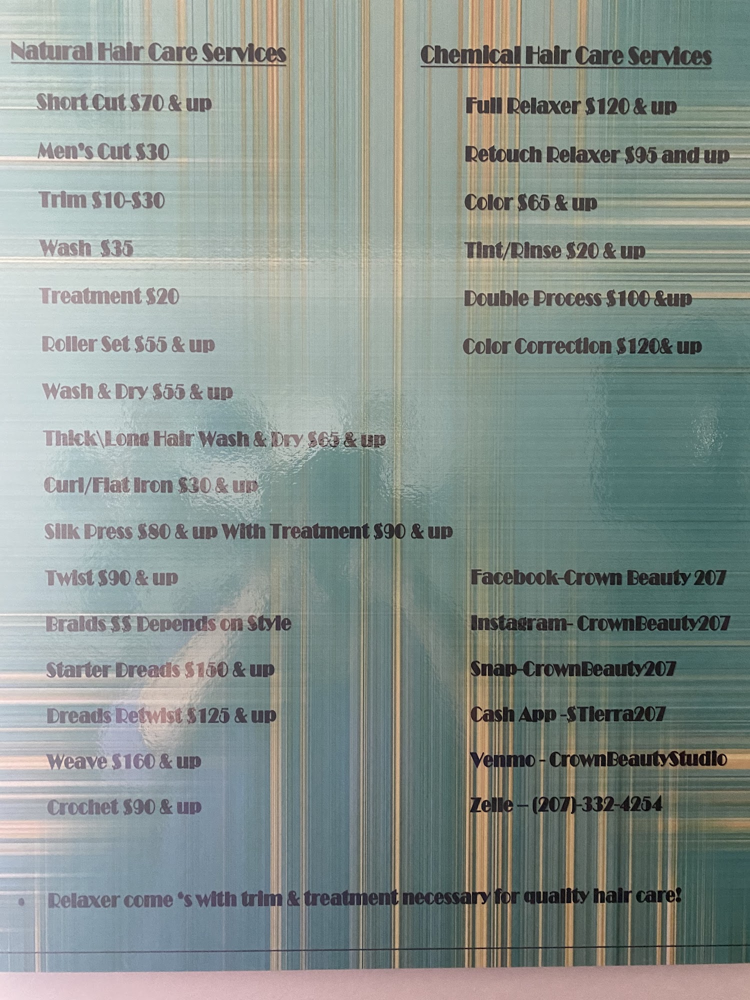 I love Crown Beauty Studio.I would recommend this place, I look forward to my appointments. I get my hair and nails done here.