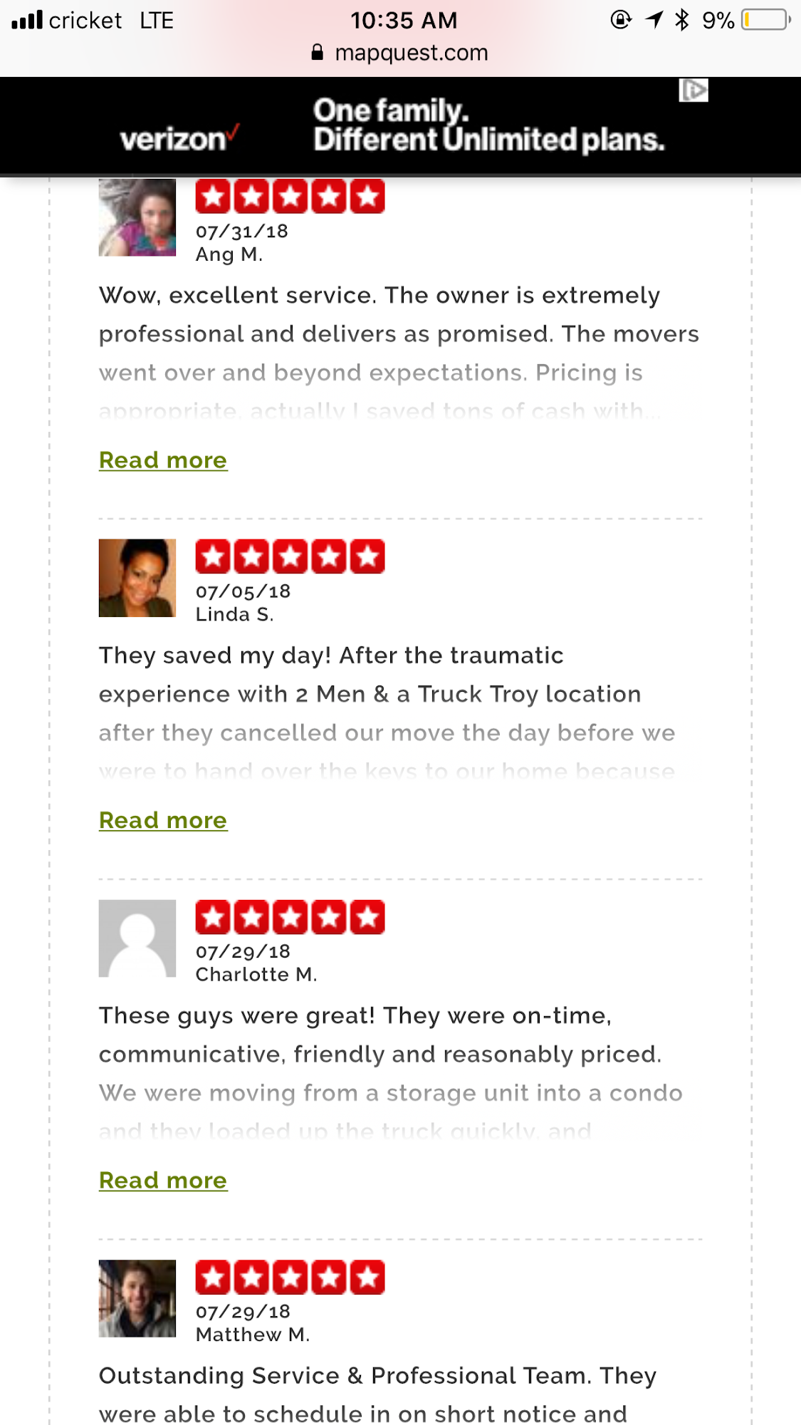 Five star service, no damage, hard working men who have been doing this for some time. Tim, Travis, Bobby and Jesse were amazing to work with! I have never seen 4 guys work so hard. We had a big move and I was super expressed with their stamina and work ethic.