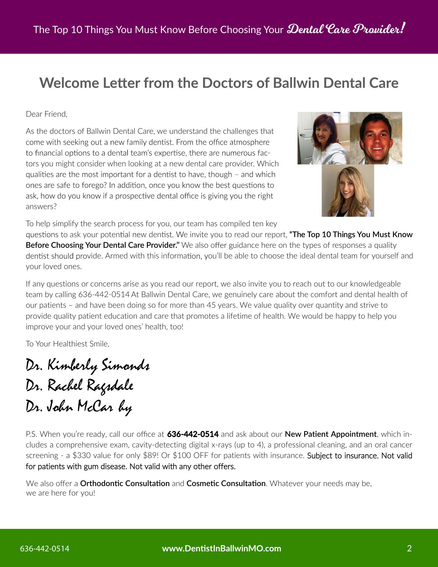 We became new dental patients today at Ballwin Dental Care. What a wonderful experience! Our hygienists, Anne and Kellee, were kind, knowledgeable and professional. Dr. Nolan was personable, having a wonderful bedside manner and again professional and easy to understand in his explanations. This office offers evening and some Saturday hours which really helps our family's work and school schedules. The ladies at the welcome desk were sweet and helpful too. Hats off to great dental service at Ballwin Dental Care.