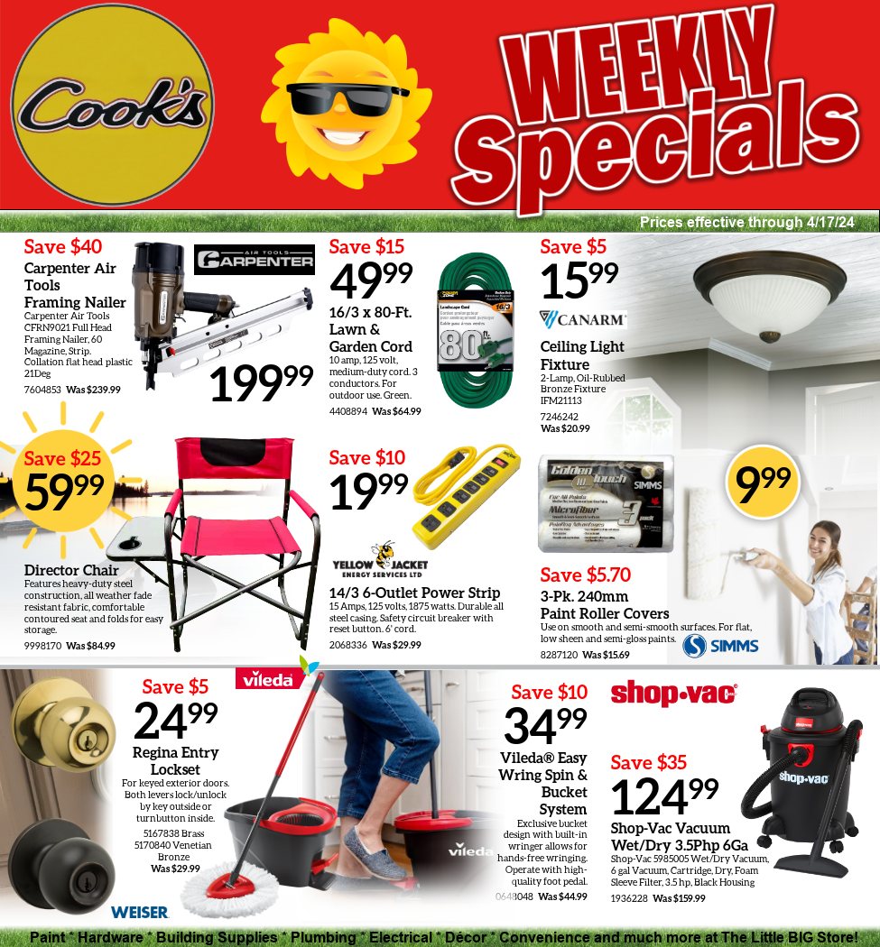 They have a little bit of everything here. I always check Cook's before heading to town. Chances are they have what I need.Once a friend was fixing some plumbing for me on a Sunday. He needed a part. Cook's was closed but he called them and they opened up so he could get the part and save us a two hour trip to town.I love their gift (home decor) isle. Always something for that hard-to-buy for friend.The staff are so friendly.