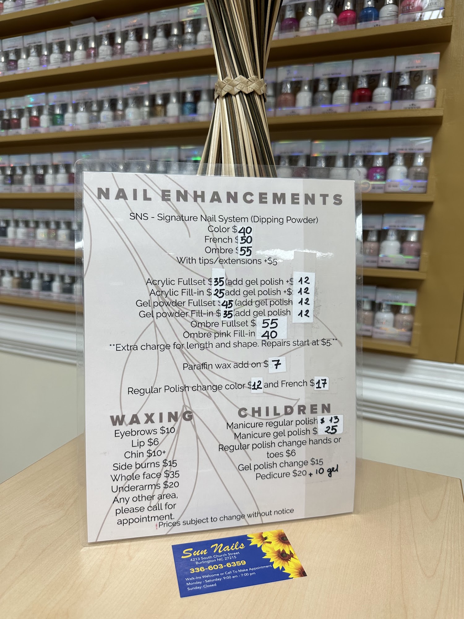 Called and asked if they could do mani and pedi's for 2 people. They could. We were greeted warmly when we arrived. They were very professional and thorough. We enjoyed our time at Sun Nails.