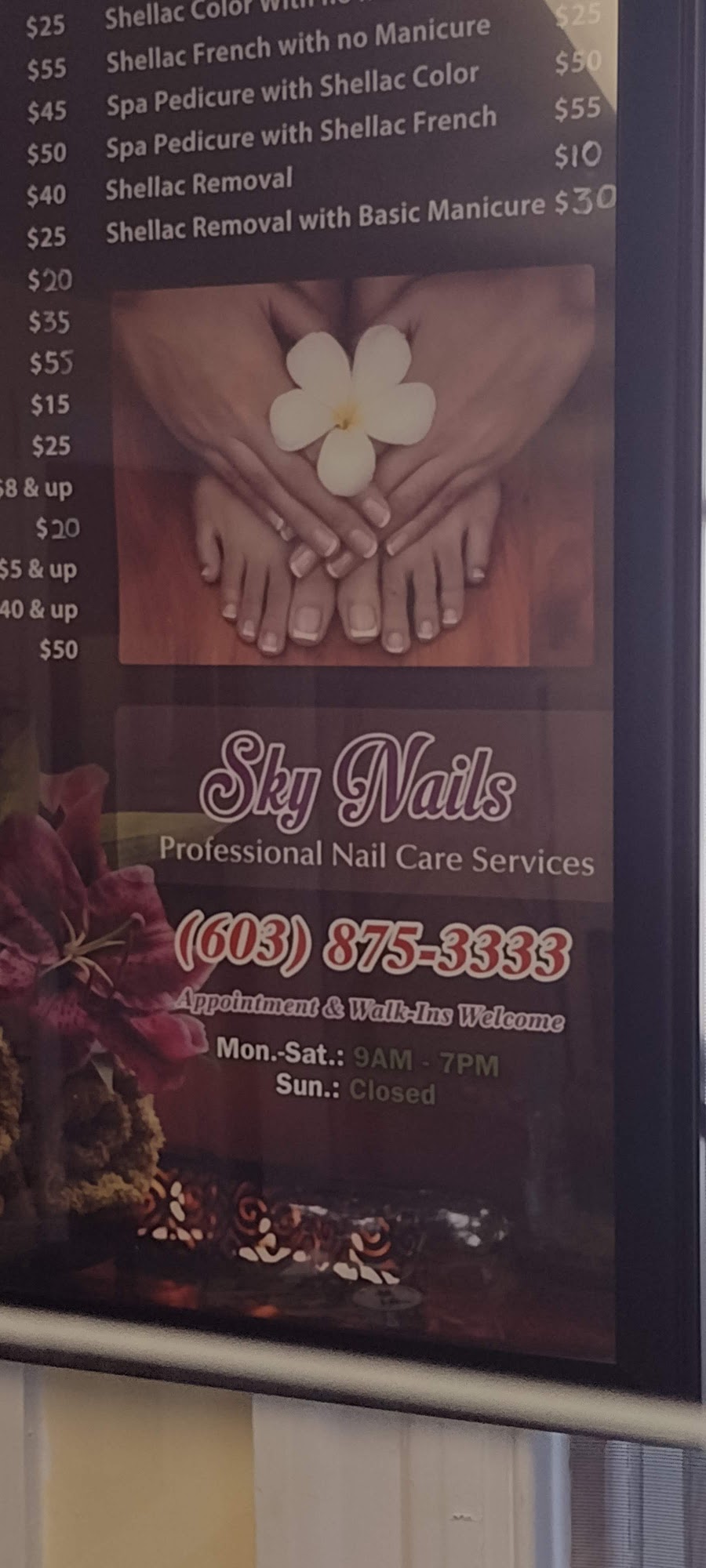 Love sky nails! It’s just the two of them but they are so friendly and are very good at what they do. The atmosphere is very relaxing. They always offer complimentary drinks and are focused on you and making sure you are comfortable and you get exactly what you want. They are very busy so even if you call and have to leave a message to make an appointment they will always get right back to you. Highly recommend!