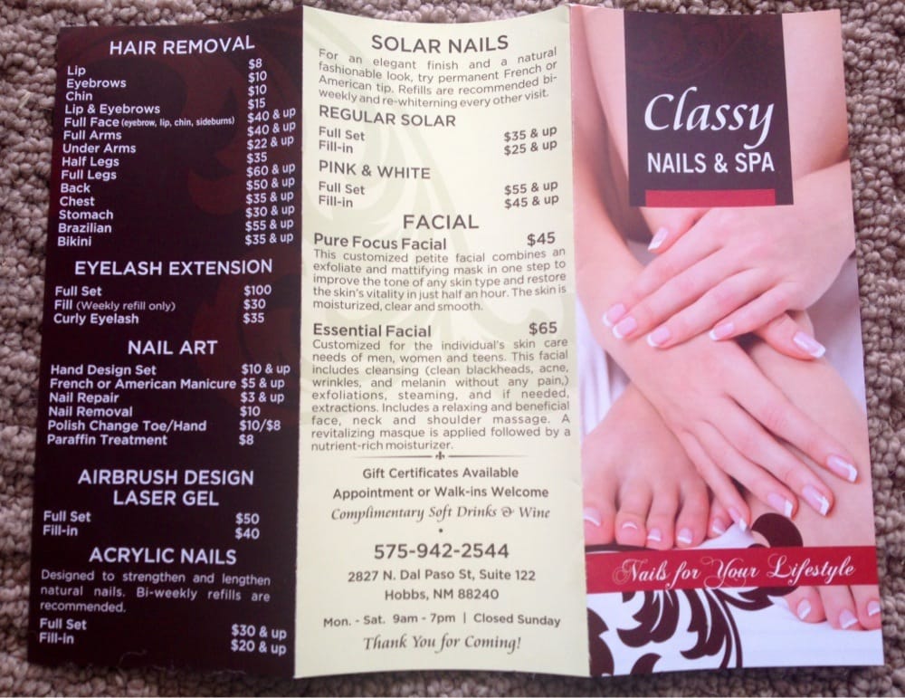 OVERALL While Classy Nails and Spa may be the most pricey nail salon in town, they certainly are top notch with service and cleanliness. RATING BREAKDOWN Manicure: 5 | Service: 4 | Ambiance: 4 | Price: 3 PARKING Ample, free parking at the Dal Paso Center on Dal Paso Street. LOCATION/AMBIANCE This rather large nail salon and spa is situated in the Dal Paso Center, which is a really great plaza on the northeast side of town. When you enter, there are manicure stations to the left with a separate room to the right where pedicures are done and more manicure stations are set up. Highly recommend that you wash your hands before your mani... they appreciate it. MANICURE For... read full review