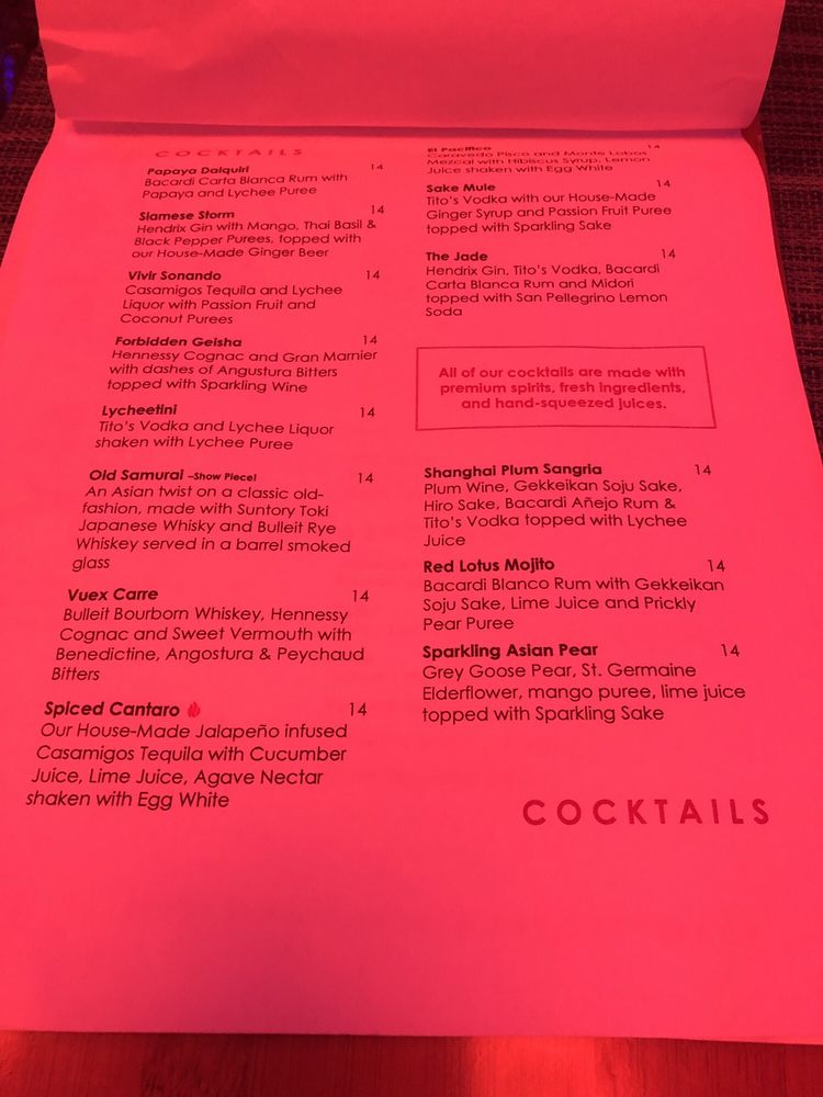 It was a Thursday night, I did not expect it to be that lively. A great surprise. There was a mandatory coat check which I think was good because they do have hookah and high top tables, that avoid any accidents. They had a photographer there taking pictures, a dj, strobe lights--- when I say it was a party vibe... it was a PARTY VIBE.Food was amazing. They have a great variety of Asian and Latino food. I didn't see many fusion items it was more of Asian Menu/Latin Menu. Either way the food was fresh, savory, and presented well.One little thing about the service, our appetizers came and we finished it--- the beverages still hadn't arrived. Worse part is that... read full review