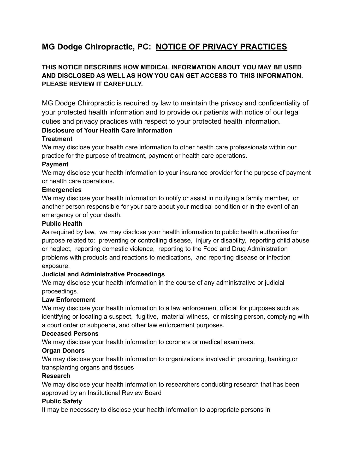 If you've never been to a chiropractor or your looking for a new one MG Dodge is where you need to go. The moment you walk into her office your more relaxed. Over the last 6 years I have visited her office, I can honestly say I always feel better verses the pain I walked in with.