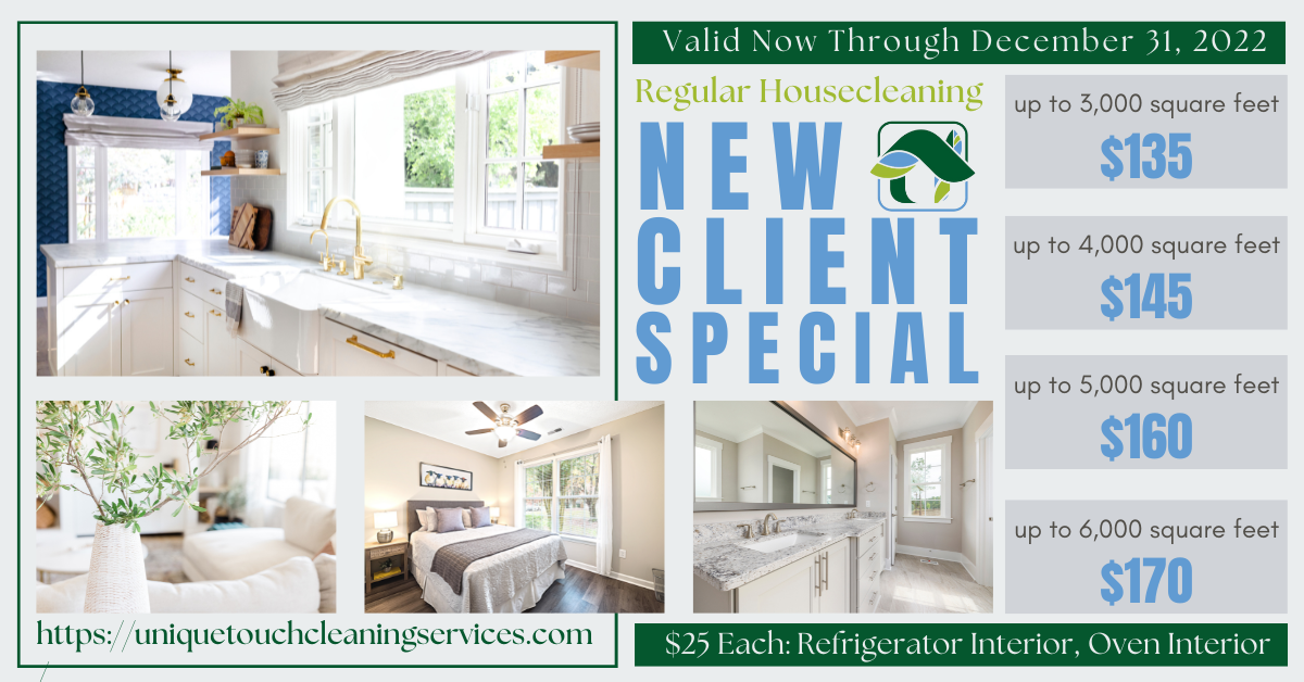 I used Unique Touch cleaning for a deep clean ladt Monday. They did an amazing job. They were on time highly professional and my house hasn't looked this good in a very long time. thank you thank you