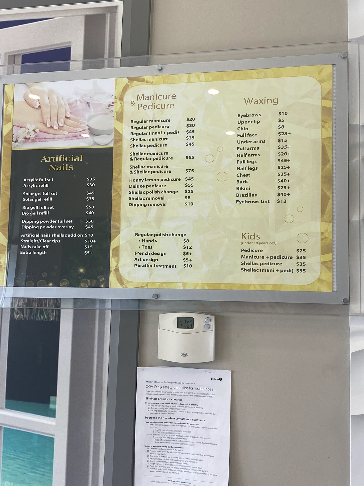 The salon is beautiful and very quiet. I was a little late for my appt but they were very accomodating. I typically get a mani pedi every other week, but I was away for an extended period of time and this was a new salon for me as I'm only in town for a month. I was surprised that they didn't use the disposable plastic liner in the foot bath, I thought that was a health requirement. I did look online and I couldn't find a reference so that may not be the case for Newmarket but every other salon I've been to uses them, so I was a little apprehensive about this. During my manicure, I used the nail soak but they didn't use the cuticle softener and... read full review