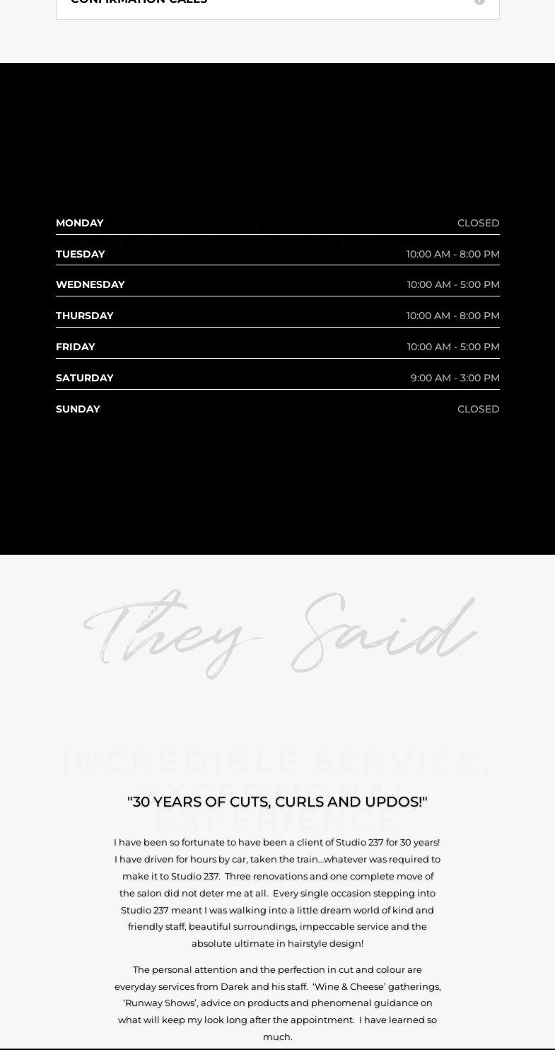 Amazing. Both my boyfriend and I are happy with our hair cuts. Our stylists were exceptional both with service and knowledge. My boyfriend's stylist even gave him a sample of a product to try. Great prices. It was our first time there, but it won't be our last! Thank you, Studio 237