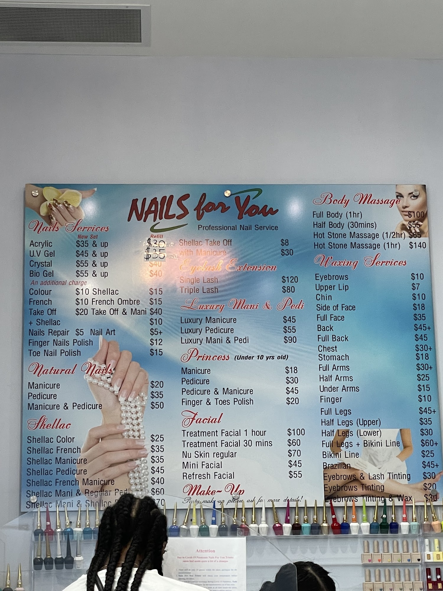 They have a large selection of polishes to choose from as well. They prioritize cleanliness and hygiene, using sterilized tools and maintaining a clean workspace. These are probably the best full set I've had and I was in and out in 30 minutes. Almost with Nails For You never let me down. I got gel nail polish over 2 & 1/2 weeks ago and it is still on and they look flawless!