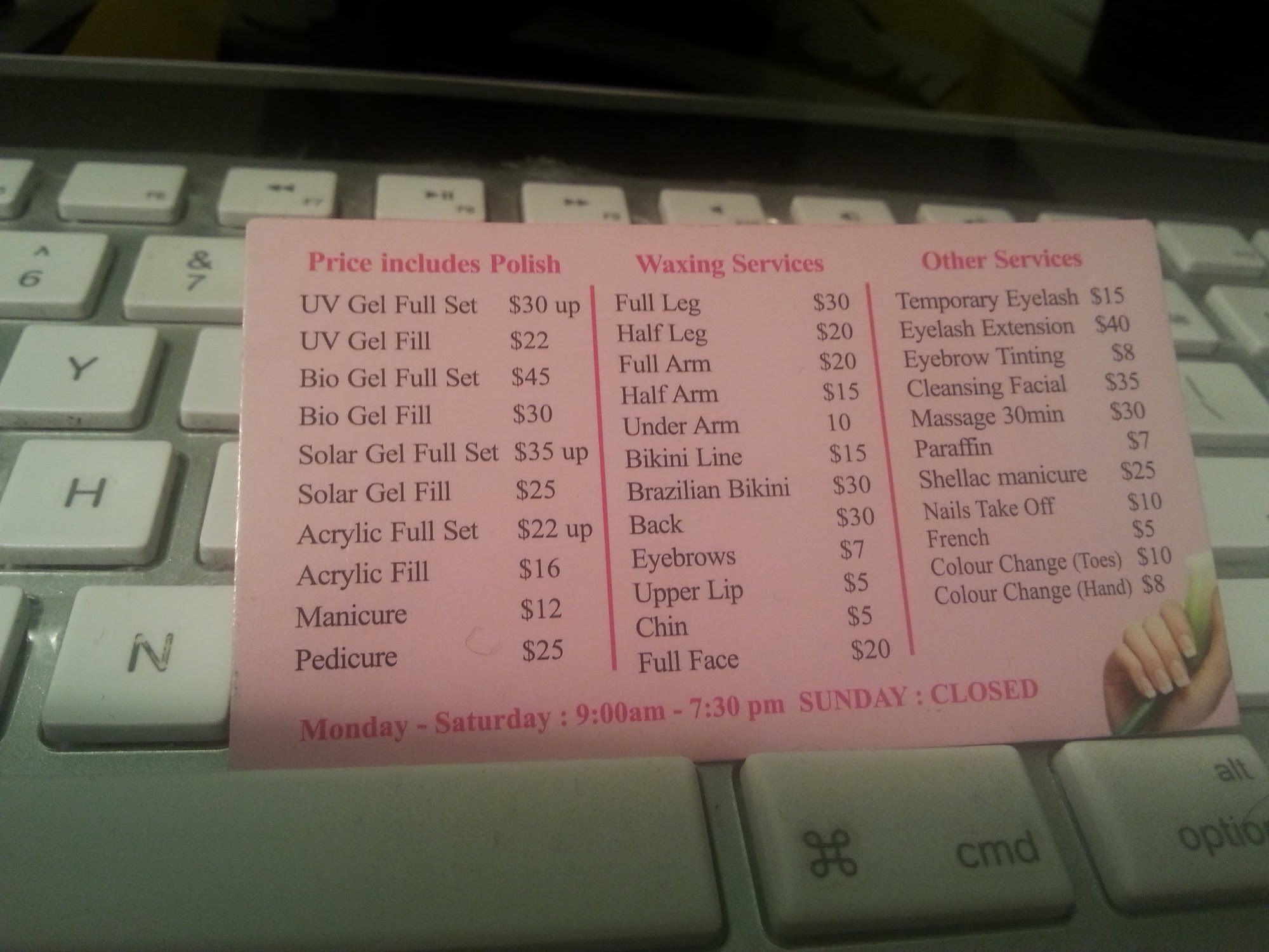 This cozy little salon is clean and bright. Room for two manicures and two pedicures. Both technicians do beautiful work. Excellent gel nails, shellac, or regular polish. Pedicures and manicures always finished with a skilled massage.