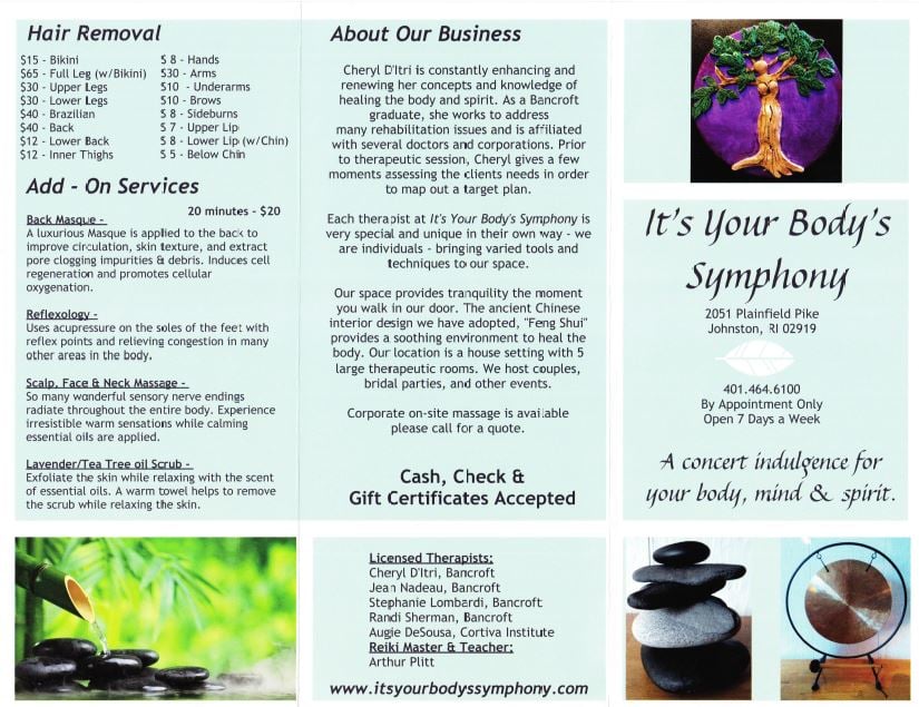 Routine self-care is a must and Cheryl and her team are highly recommended. A gift certificate from It’s Your Body’s Symphony is my perfect go-to gift for my family and friends to spread the wellness they deserve. Additionally, I have gone for massage treatments to aid the recovery for post-surgical care. The tailored massages are providing much-needed relief when PT and other medically focused treatments weren't helping.