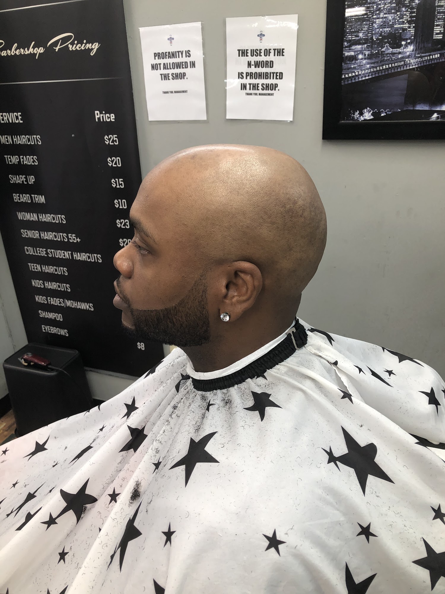 The atmosphere within was great.... The barbershop, including female stylist was very professional and very friendly, it was like, sitting and chatting with friends. Ill definitely be returning soon