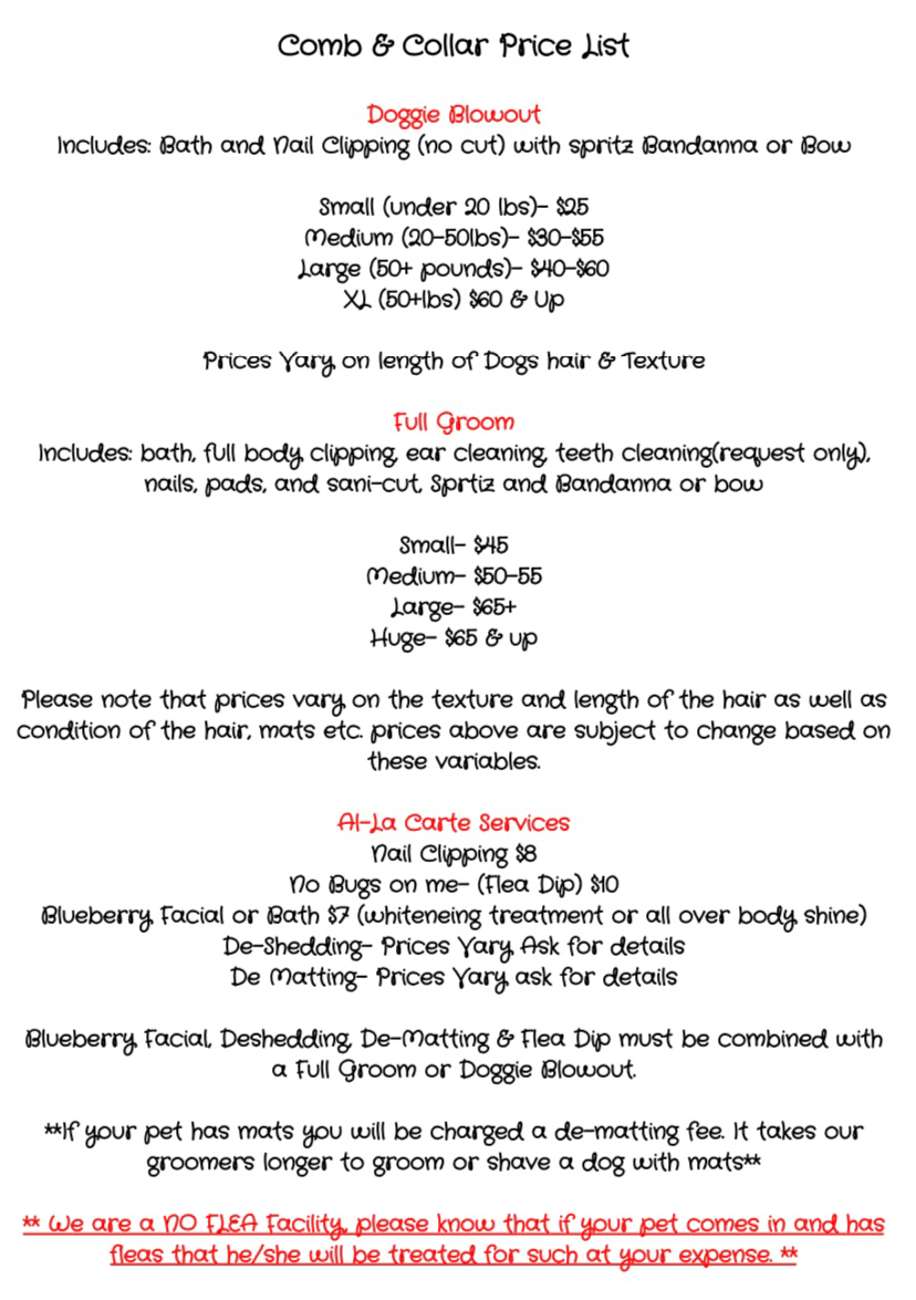 Comb & collar did amazing on my dogs! We have one goldendoodle & one aussiedoodle. Their coats are very high maintenance, so having an amazing groomer makes ALL the difference. They were seeing another one that kept leaving mats & unclipped toes & wouldn’t clean their ears. So I brought them to comb & collar & she did an amazing job with them. She groomed every inch of them! They look like the little handsome pups they are now! She got me in last minute because we were desperate to find someone to fix the mess that was done from the previous groomer. She was really sweet to the dogs as well, which is important knowing I’m leaving them in caring... read full review