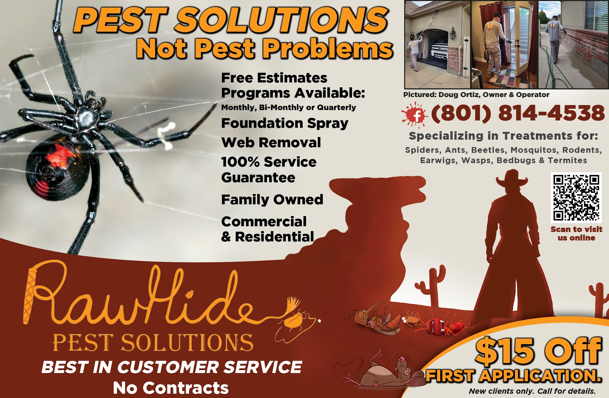 I own a Salon. Doug came in early and before we started with clients to accommodate our busy schedule. He was efficient in a very, timely manner. We had been invaded by several different critters and that was not working for us. So we are now clear of these pests. He put us on a regular schedule. That has made it so I have one less thing to worry about. Thanks for helping us and our clients feel comfortable in our space.Services: Spider extermination