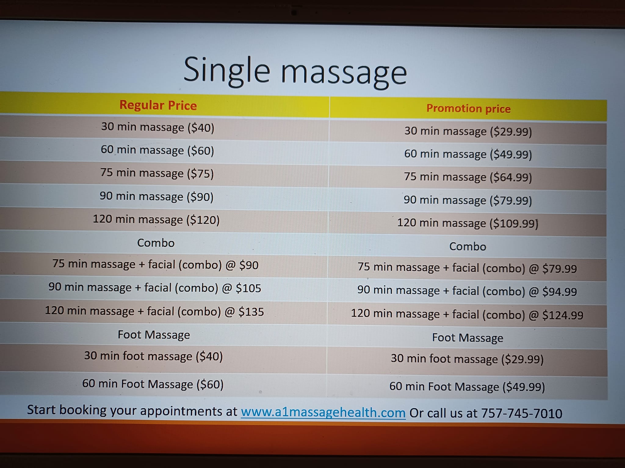 First massage ever and I LOVED it. Very relaxing atmosphere, gentle music playing and my massage therapist was excellent and very respectful. Asked if there were any specific areas I needed targeted, and checked several times to be sure I was comfortable. Planning to go back!