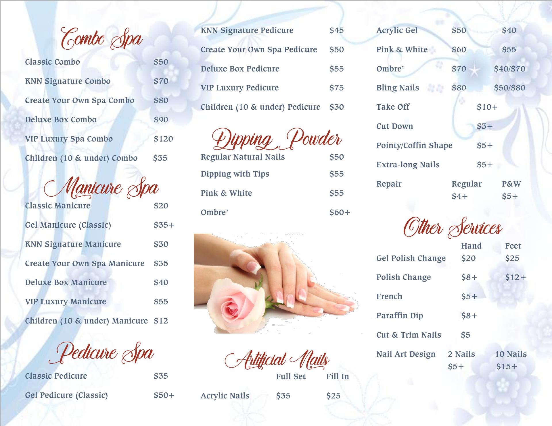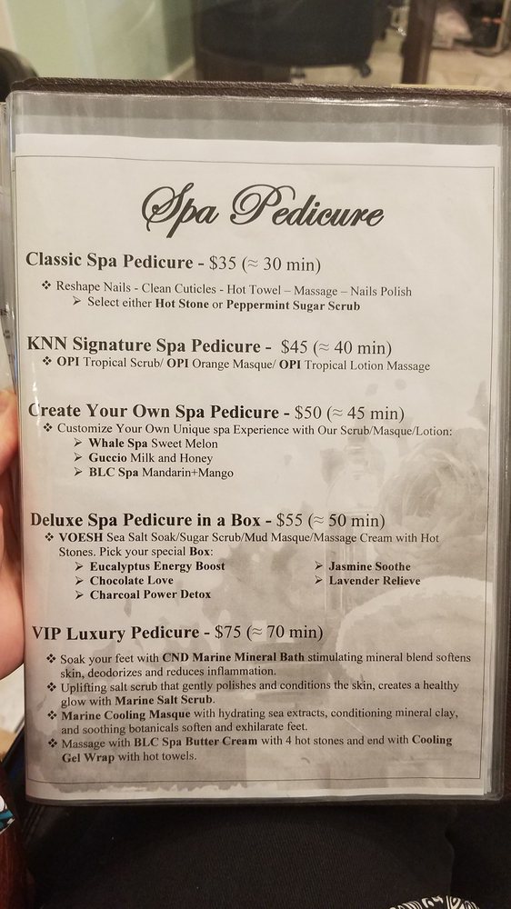 My experience at KNN Nails was excellent! I was able to walk in for a mani-pedi and only waited 5 minutes. The staff was very friendly. My nail tech listened to my requests for how I like my nails done. She even offered to polish an additional coat to ensure longevity. The environment is relaxing. I was pleased with the cost and service! I will be going back!