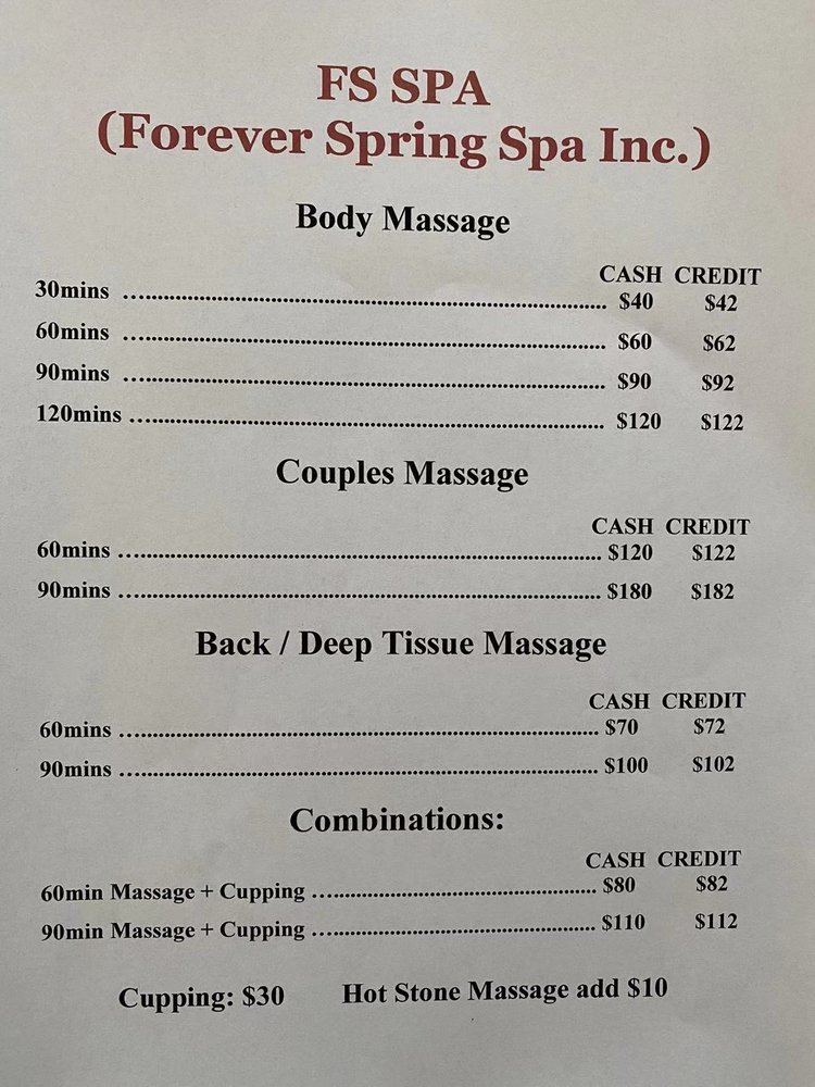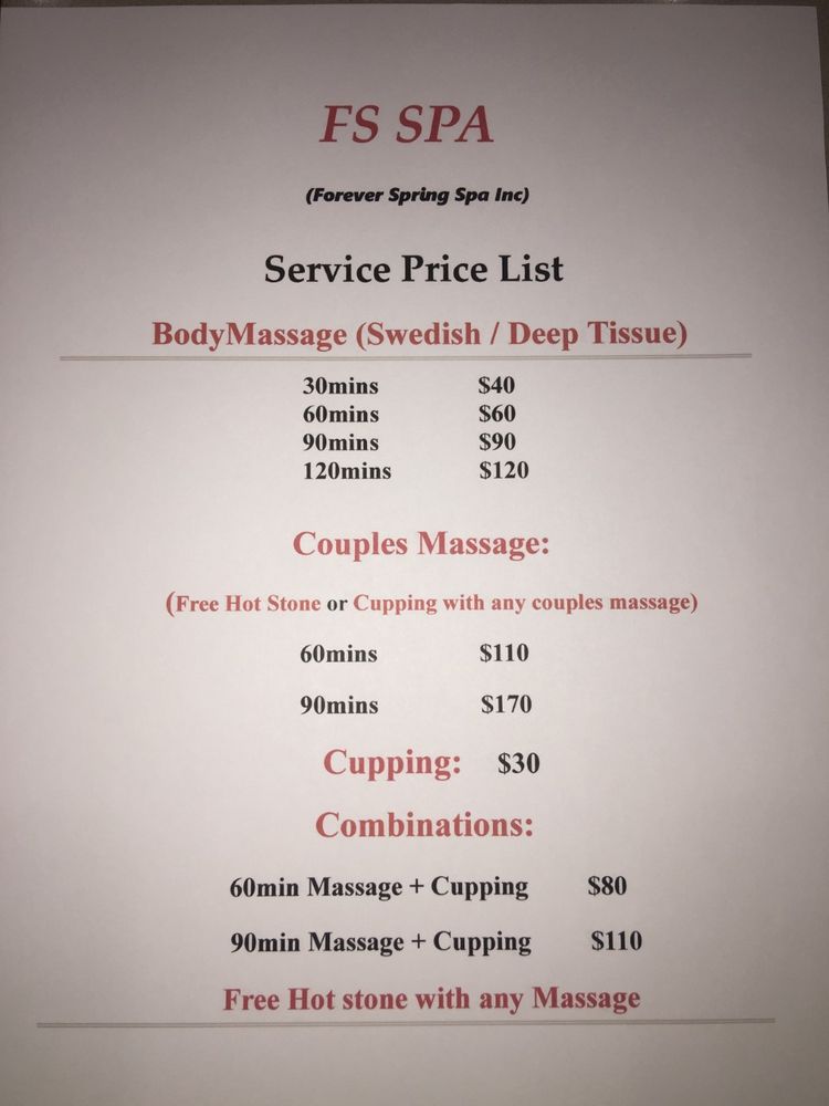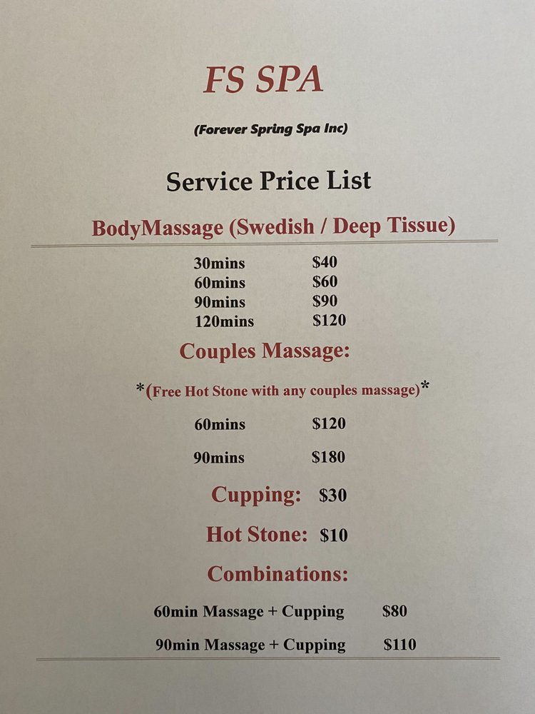 This place is extremely pleasant, clean and very professional. I was in a jam and was having trouble getting into my regular massage therapist. So I asked around and was referred to FS massage. WOW… I have had others massages and consider this one of or maybe the best massageI have ever had. Kaycee listened to what I needed and did a perfect job. I have bad knees, shoulder and lower back pain. She was very accommodating to all my injuries and surgeries. I got the herb oil and hot rocks !!! YOU GOT TO TRY IT!! And yes the oil and rocks are extra but definitely try the hot rocks. Just leave some for me. Enjoy.?