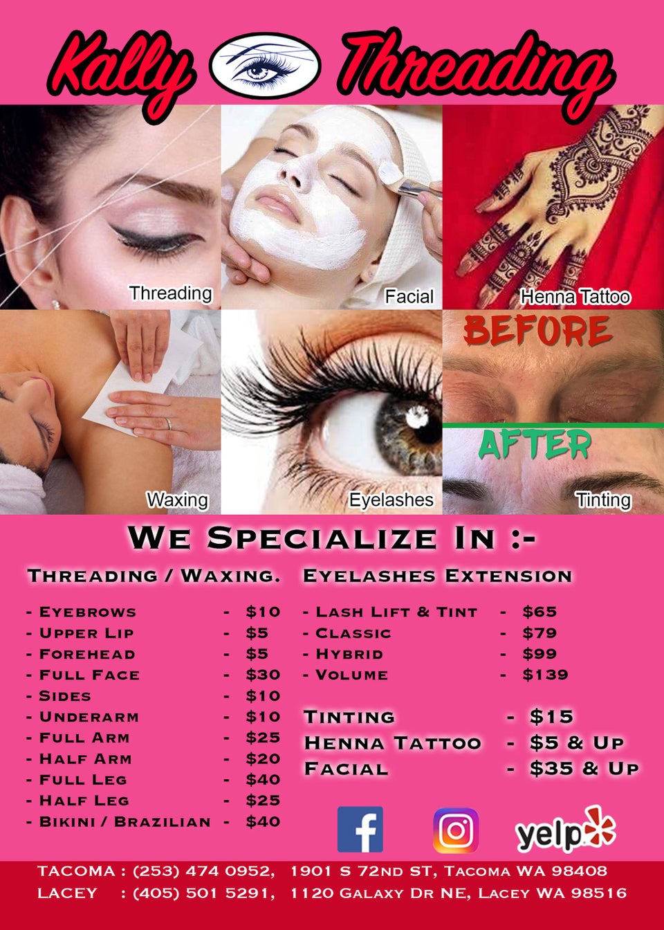Just left Kally Threading and Ruby took good care of me. Had threading on my eyebrows, upper lip and chip. She was quick, very nice and made sure I was satisfied with her work. I am coming back! ? I highly recommend Kally Threading!