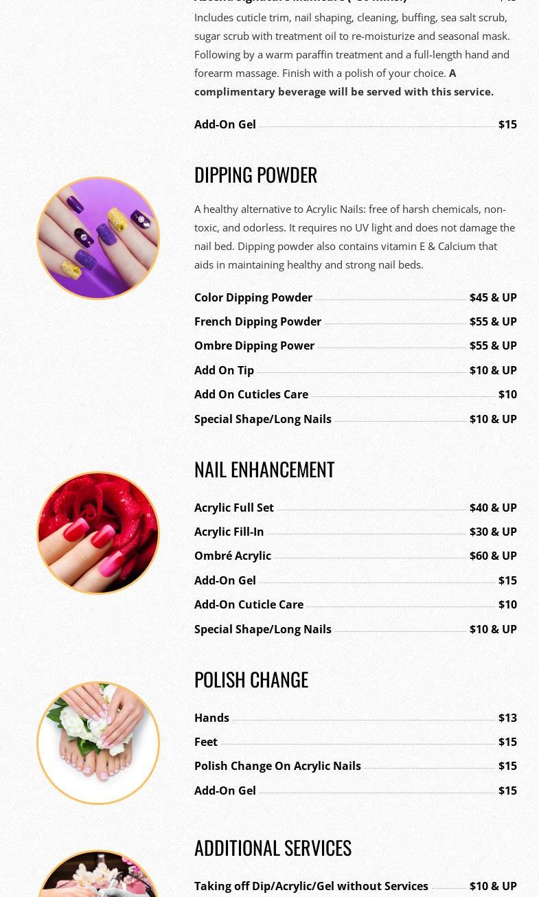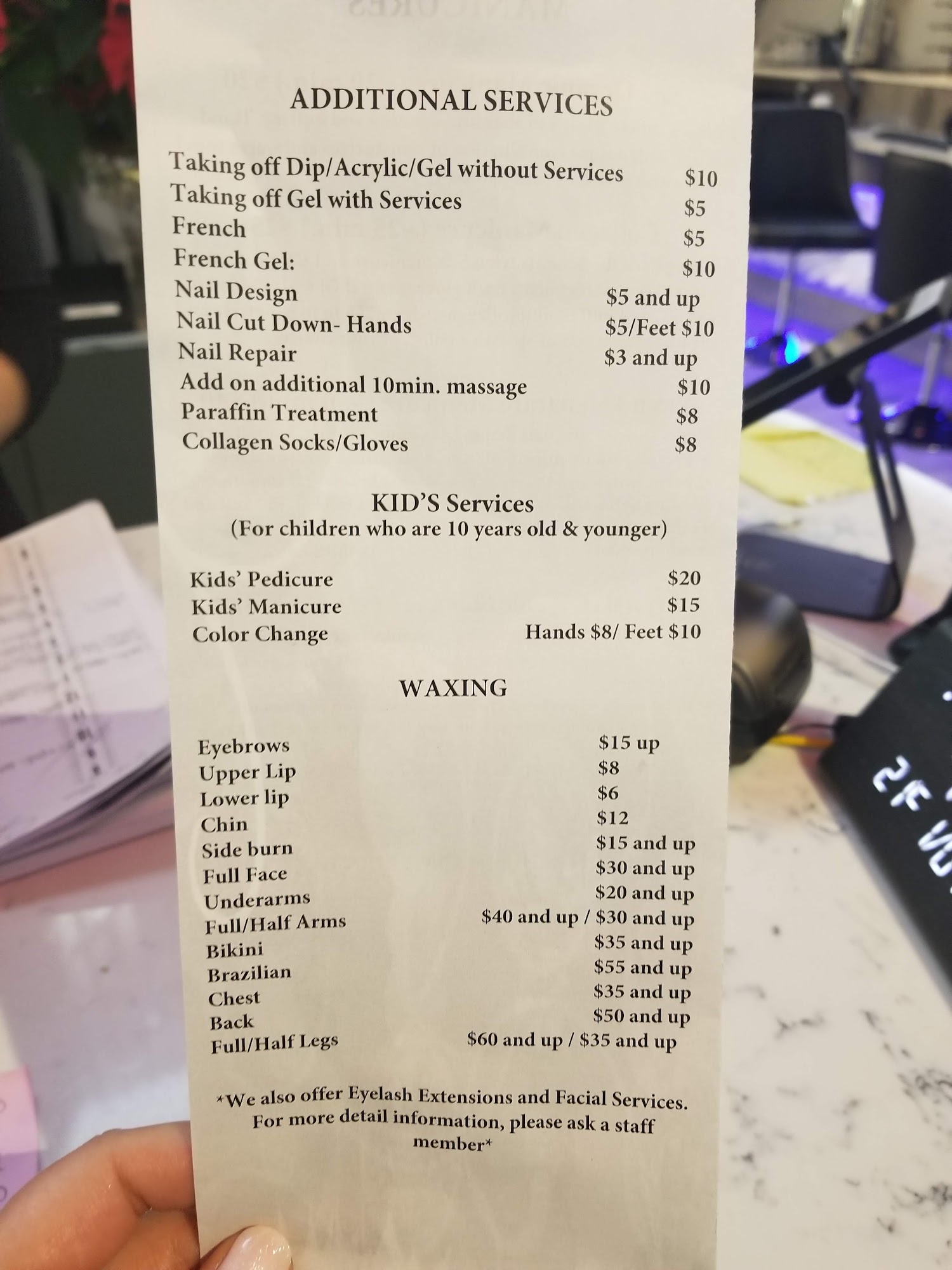 They just charged crazy prices and didn't tell me even after asking. I needed to get my nails done so I went and I showed them my current nails and my Inspo photo. She told me for the Chrome I wanted I would need to pay $15 extra dollars which I was fine with. $35 + 15= $50 ... the math checks out. She did my nails. She did a great job. I'm happy. We get to the register.... $65. BEFORE TIP. Umm miss ma'am. Your math ain't mathing. It was supposed to be $50 as you stated. $35 for the work she says. $15 for chrome she says. THEN $15 for polish she says. Hold up.... Wait... So the $35 does not even include polish? You would do the work and leave them... read full review