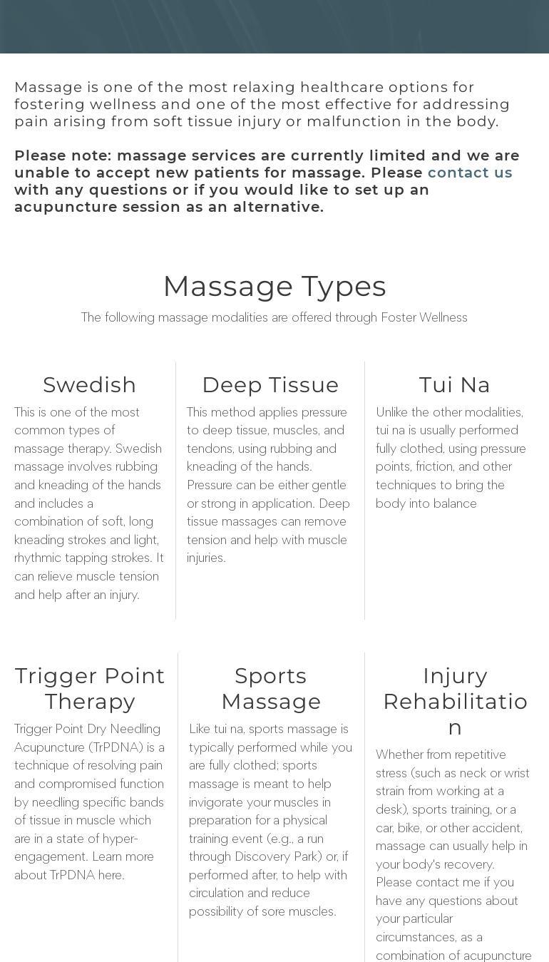 Greg is kind, thoughtful, a great listener and his treatments have provided me with exceptional pain relief. I have a spinal fusion resulting in some nerve pain, and it's controllable with his services. I have sent many of my family and friends to Foster Wellness, and they have all been pleased with their treatments and outcomes.
